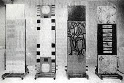 Marion Tischlers Malerei ordnet geometrische Formen und manchmal auch grafische Figuren auf hochformatigen Leinwänden. In der Ausstellung stehen diese Bilder nebeneinander frei im Raum. Der Besucher fragt sich (anders als angesichts der Haller-Skulpturen), welchen eigenständigen Weg die Studentin mit ihrer Arbeit suchen und möglicherweise finden wird.