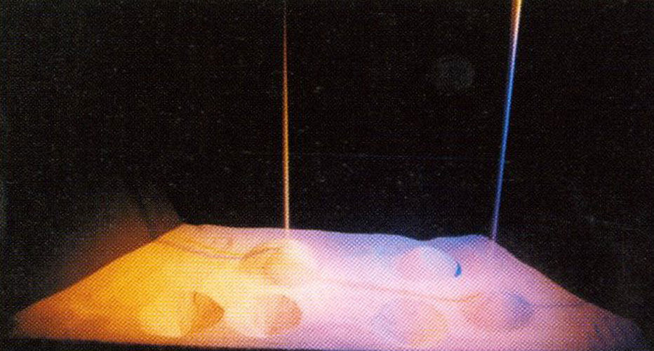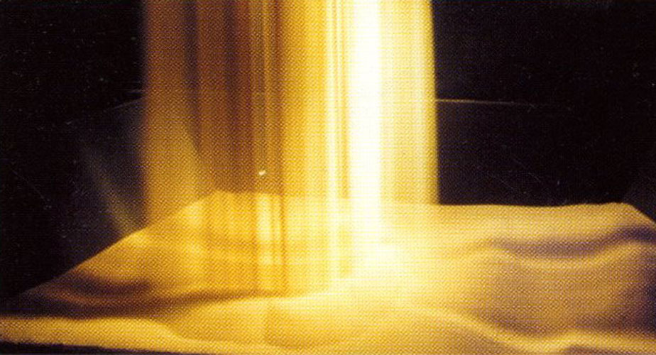 Das Material Sand habe ich auf seine dramatischen Eigenschaften hin untersucht und szenische Abläufe entwickelt. Ich stellte in meinen Versuchsreihen fest, das Sand formbar ist, wenn auch nicht in dem Umfang, wie man sich gemeinhin vorstellt. Die Verschiedenartigkeit der Formen, die konkrete Ablesbarkeit von Bildern ist mein Anliegen. Das entstandene Stück ist in zwei Akte unterteilt, die klar eine eigene Formensprache repräsentieren. Der erste Teil beinhaltet ein Spiel linearer Elemente, die alle in Parallelen zum vorderen Bühnenabschluß geladen sind. Der zweite Teil hat Rundformationen zum Thema. Es handelt sich um eine Abfolge von wandernden Sandstrahlen und -rillen, von einer Furche und einem Wall, die die Oberfläche ganzheitlich aufbrechen, und einer länglichen, geschüteten Sandwand. Es entstehen Hügel und Krater, die aus den Tiefen des Sandes sich entwickeln, und Aufschüttungen von oben herab. Und abermals Sandwände, dieses Mal in Halbkreisform. Die erste starre Sandebene erfährt zum einen Veränderung von Außen: durch Sandstrahlrieseln und -schütten. Diese Einwirkungen können sie minimal sein, dass sie keine deutlich sichtbaren Spuren hinterlassen. So die Sandstrahlen, die für sich vor dem schwarzen Hintergrund stehen, Eigenständigkeit erlangen, um dann doch in dem kleinen Sanduniversum unterzugehen, sich mit dem dort befindlichen Sand zu vermischen und nicht mehr auffindbar sind.