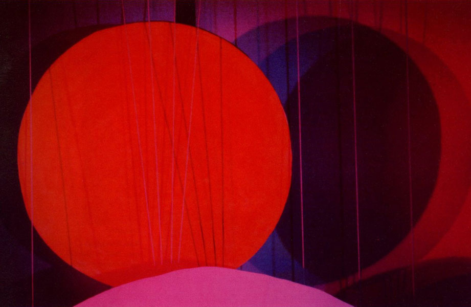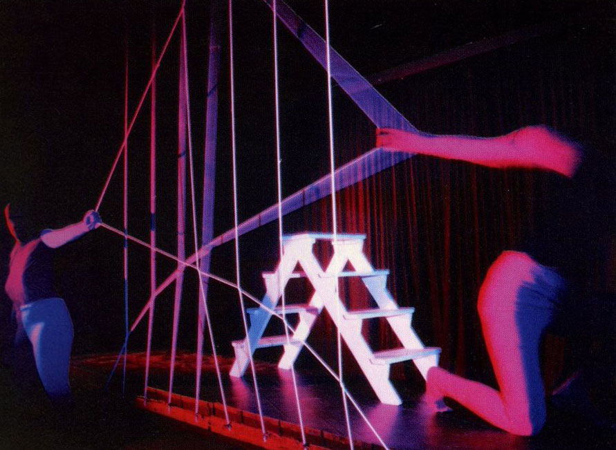 Der Schwerpunkt der 1. Szene liegt auf dem Spiel mit bewegten Farbformen. In der 2. Szene dominiert das Zusammenspiel von unterschiedlichen Formen, gebildet durch das statische Element einer Schenkelleiter und den bewegten Körper- und Gummischnurformen. Das Schaffen von Räumen bestimmt das Wesen der 3. und 4. Szene.