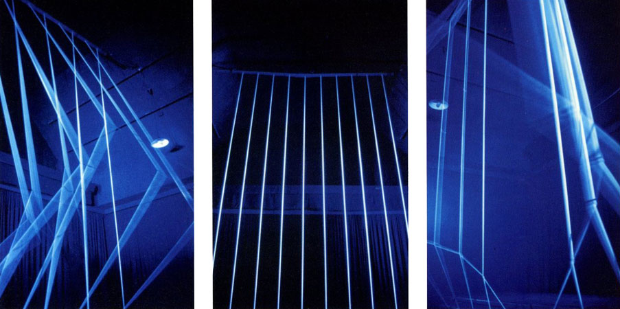 Die Grundbühne unseres Stückes besteht aus einer Aufspannung von parallel-vertikal angeordneten Gummischnüren, die in der Mitte des Bühnenraumes eine Wand bildet. In den insgesamt vier Szenen des Stückes wird diese Grundbühne durch variierende Elemente ergänzt und bewegt. Durch die Elemente Musik, Licht, Farbe, Form und Bewegung wird eine Beziehung hergestellt zwischen Raum, Figur und Gummischnur.