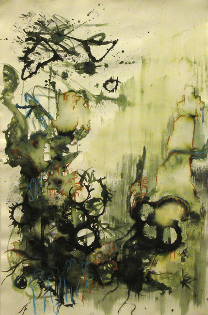 Die stark von den Umgebungsfaktoren abhängige Wasserfarbe führt zu immer wieder neuen und einzigartigen Bildelementen. Wasser und Lack lösen hingegen Farbe und Formen wieder und wieder auf, lassen sie in formlose Stadien der Bildentwicklung zurückfallen oder führen bei der Trocknung des Lackes zur endgültigen Stagnation einzelner Linien- und Formelemente – wie ein Gedankengeflecht, in dem sich Dinge verdichten, auflösen oder haften bleiben.