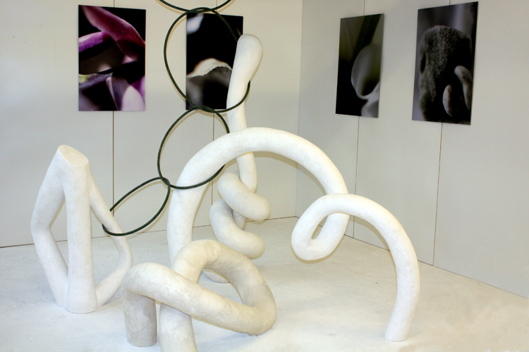 Die Prüfungsarbeit basiert auf dem Gedanken, durch zwei sich in Form, Farbe und Material ungleiche Komponenten, ein einzelnes Gebilde entstehen zu lassen. Die Statik sowie der Raum als festes Bestandteil der Arbeit werden direkt mit einbezogen. Die weißen Stellwände ermöglichen dem Betrachter durch den sterilen Farbton und die strenge Form die Möglichkeit, die Dynamik der Plastiken besser wahrnehmen zu können. Die Formgebung sowie der Aufbau der Statuen implizieren den Eindruck, dass sich das Gewicht dieser Komponente dem Boden zuneigt und somit Festigkeit und Standhaftigkeit ausdrückt. Im Gegensatz dazu bildet die zweite Komponente, die sich aus, nach unten hin kleiner werdenden, Ringen zusammensetzt. Hier schwebt das Gewicht der Komponente in der Luft, welche sie somit dem aufgestellten Raum zu entziehen scheint.