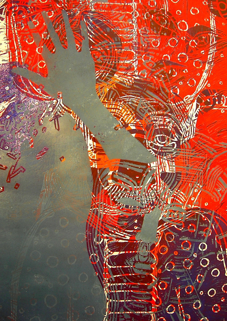 In jeder einzelnen Arbeit tauchen ornamentale, graphische Elemente auf, die eine selbstständige, metaphorische Sprache entwickeln. Viele mehrfarbige, spannende Überlagerungen und das illustrative Durcheinander geben jeder Figur einen besonderen und individuellen Charakter. Meine Figuren und deren Charakteren lerne ich erst nach dem letzten Druck kennen, die ich sehr musterhaft darstelle.