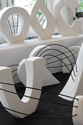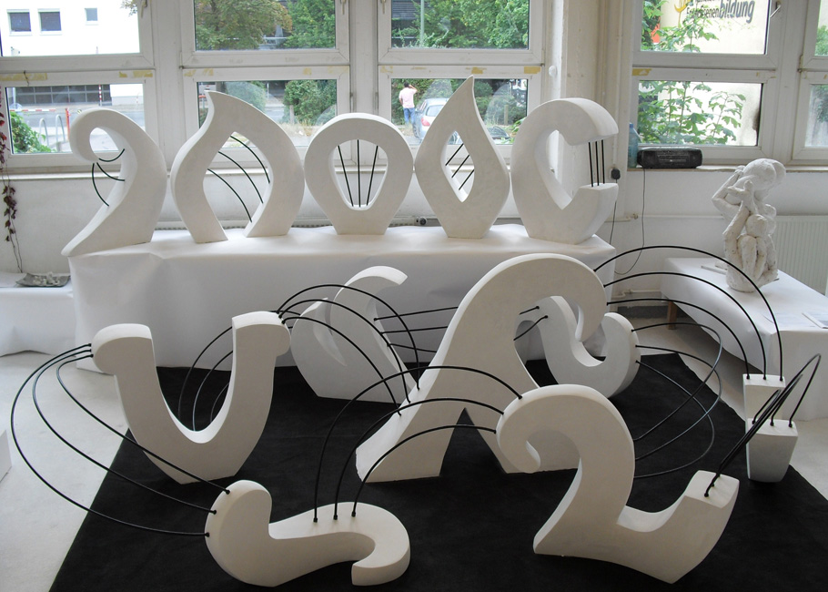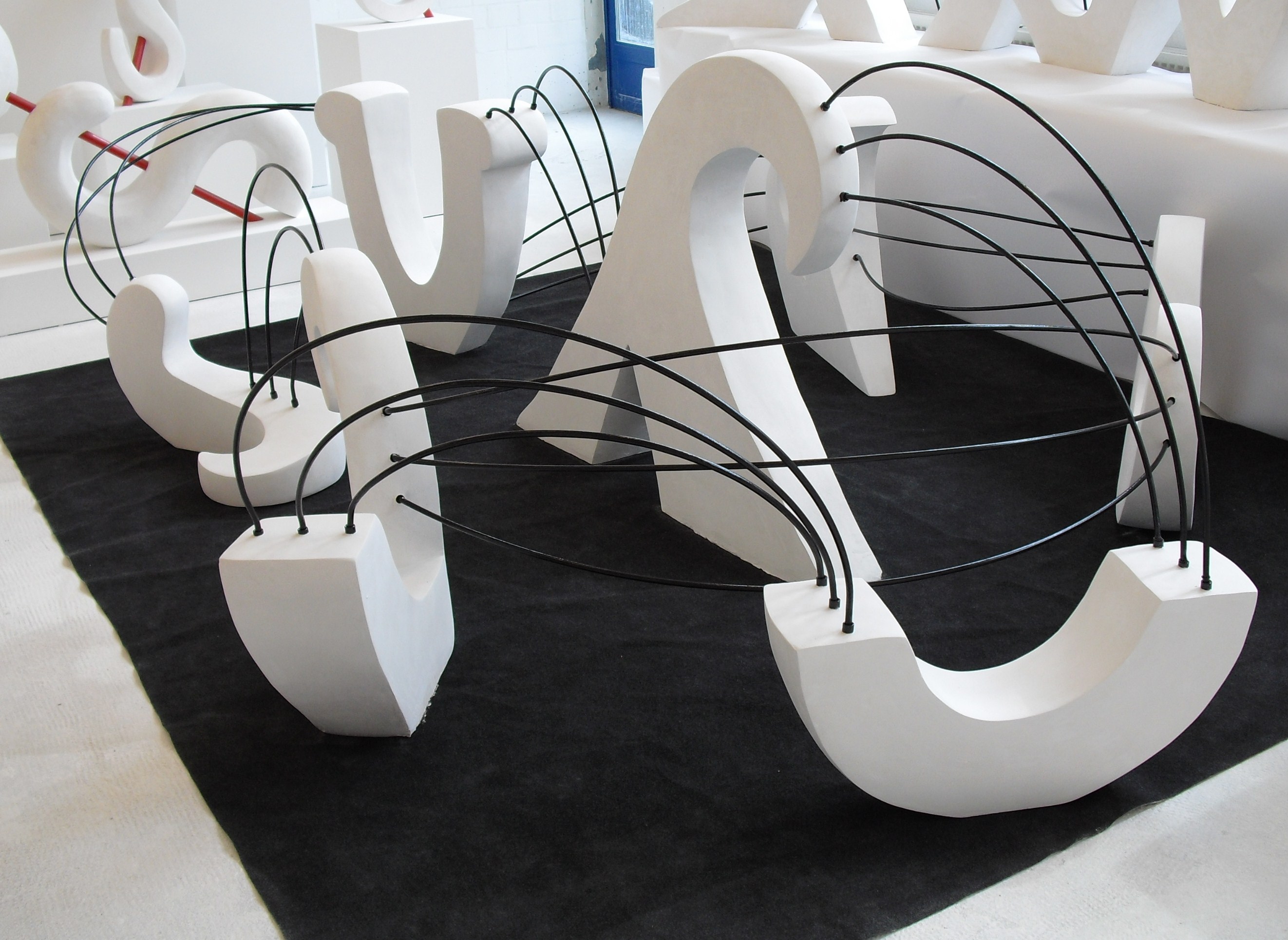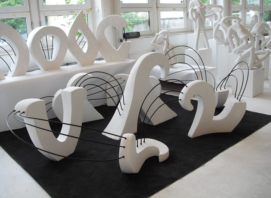 Die sieben abstrakten Skulpturen, die entstanden sind, sollen aufeinander aufbauen und sich vervollkommnen, so dass keine für sich alleine stehen kann. Sie sind aufeinander angewiesen und abhängig voneinander. Die jeweiligen drei Eisenstäbe, die von der einen zur anderen Figur führen, setzen die Bewegung von der einen fort und geben sie an die nächste weiter. Auch das unterschiedliche Material, Eisen und Gips, soll auf den Betrachter anregend wirken, sowie der Kontrast von Schwarz zu Weiß. Die unterschiedliche Größe, Form und Platzierung der Figuren, soll die Komposition spannend erscheinen lassen. Durch die Stäbe wird man dabei von Figur zu Figur geführt. Die Stangen überschneiden oder kreuzen sich, je nachdem, aus welchem Blickwinkel man schaut. Letztendlich soll die Komposition den Betrachter fesseln und in ihm das Bedürfnis erwecken, sie von oben und unten, von links oder rechts betrachten zu wollen, um immer wieder neue spannende Perspektiven und Blickpunkte zu entdecken.