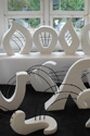 In meiner praktisch- methodischen Prüfung im Fachgebiet Bildhauerei entschied ich mich dazu, abstrakte Gipsfiguren mit schmiedeeisernen Stäben zu kombinieren und somit mein Thema aus den vorherigen Semestern weiterzuführen. Anstatt separate Figuren anzufertigen, sollte dieses Mal jedoch eine Skulpturenkomposition entstehen, mit einer zentralen Figur in der Mitte. Durch die Herstellung unterschiedlicher Modelle, kam ich letztendlich zu dem Schluss, verschiedene abstrakte Figuren anzufertigen, die in Größe und Form variieren und durch schmiedeeiserne Stäbe verbunden sind.