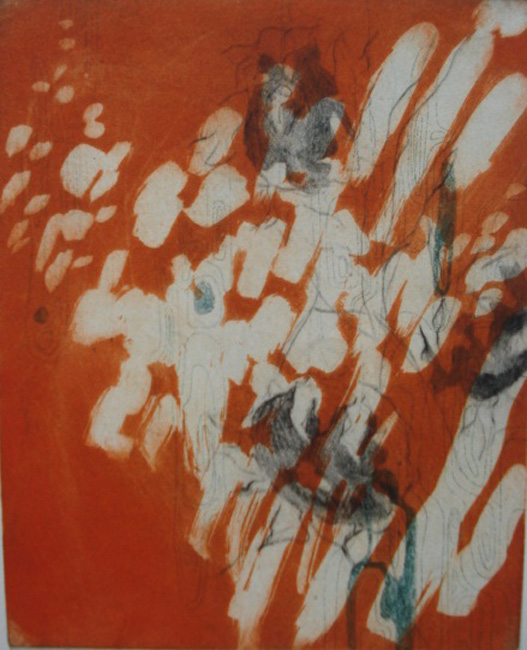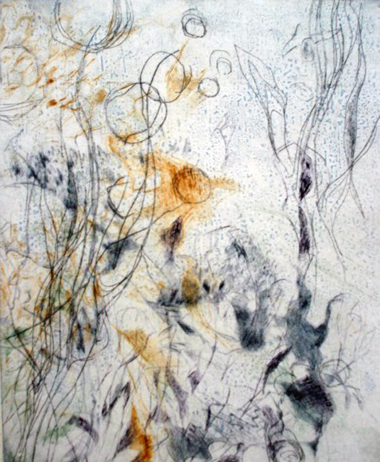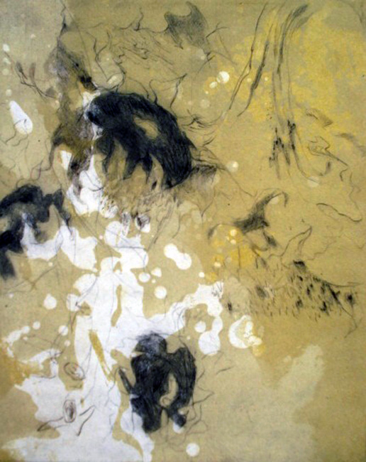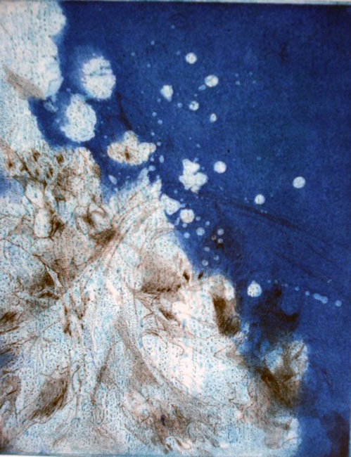 Die Reihe „Naturformen“ entstand im Rahmen der Praktisch-Methodischen-Prüfungen im Sommersemester 2012 und ist ein Experiment mit allen Techniken der Farbradierung auf dem Medium Kupferplatte. Das mehrfache Übereinanderlagern verschiedenster Flächen und Formen schafft eine hohe atmosphärische Dichte in der man scheinbar konkrete Formen erkennen mag, die sich aber wiederum in amorphe Strukturen vor dem Betrachterauge auflösen.