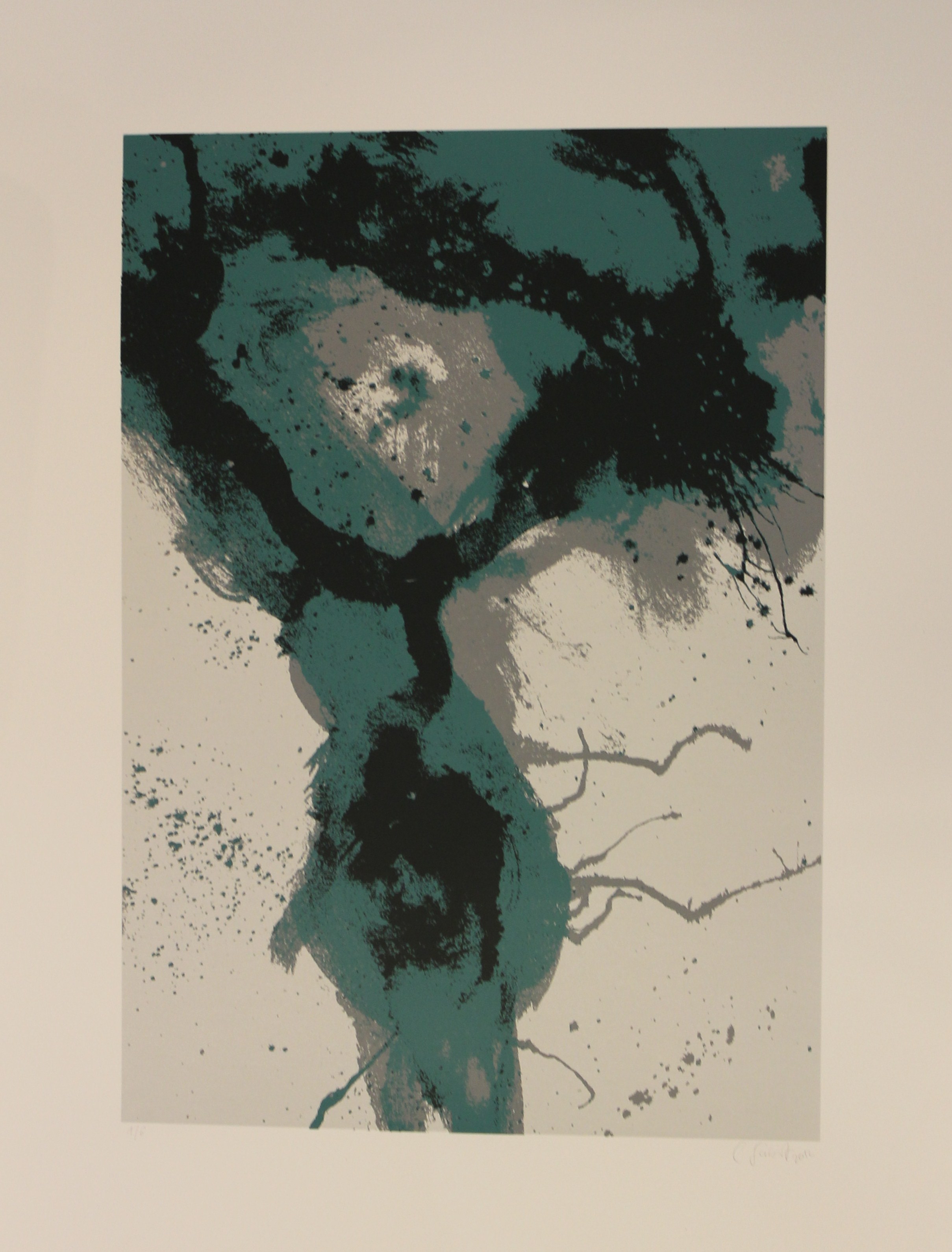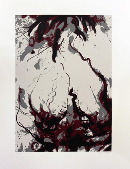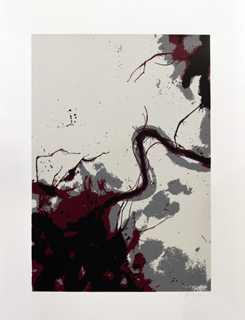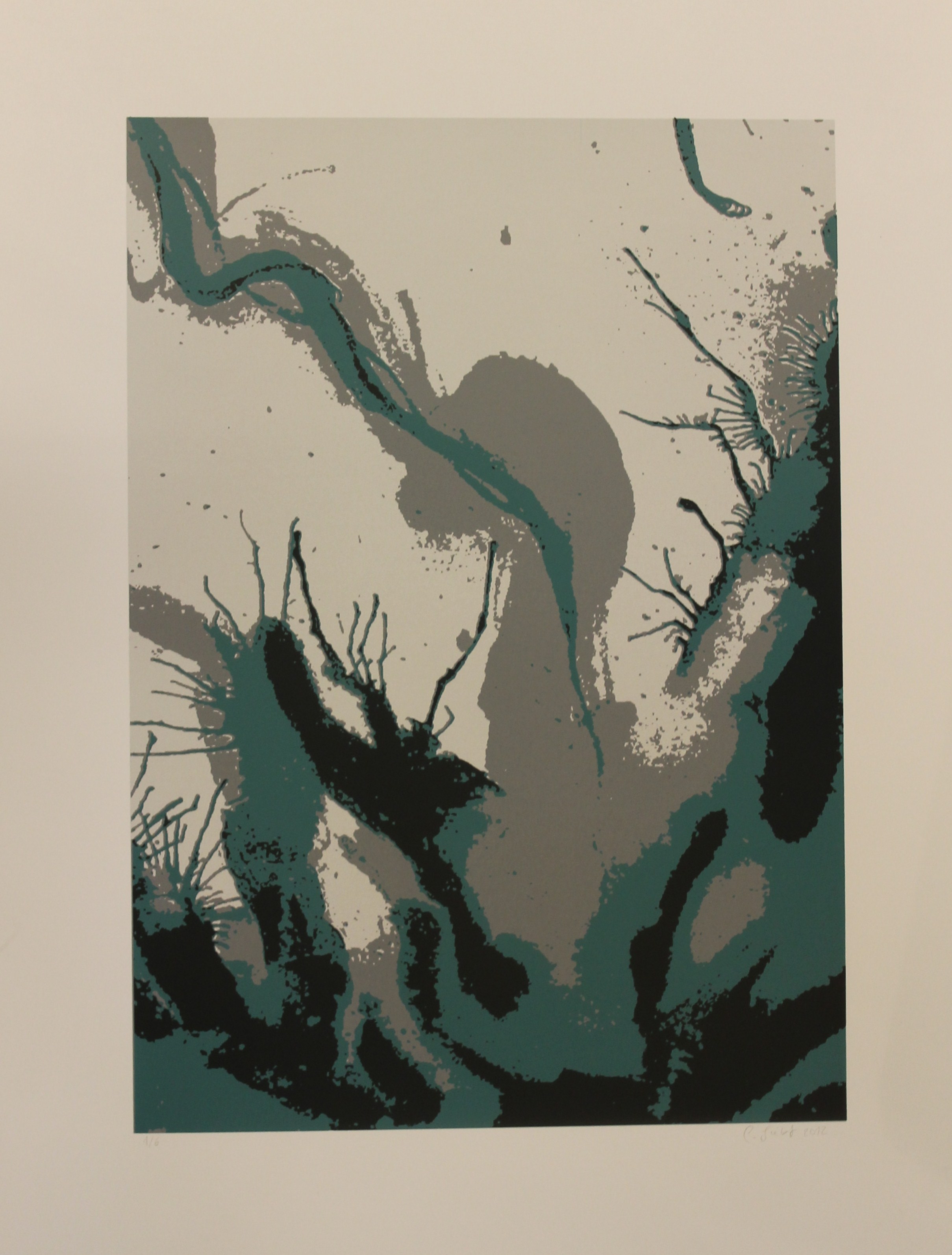 In der Malerei habe ich mich mit explosionsartigen, kraftvollen aber vor allem abstrakten Strukturen auseinander gesetzt. Diese fertigen Arbeiten habe ich dann zunächst abfotografiert, um sie später am Computer in Siebdruckvorlagen umzuwandeln. Dies geschah indem aus den Malereivorlagen bestimmte Bereiche ausgewählt, vergrößert und als neue Siebdruckvorlage dargestellt wurden. An einigen Stellen finden sich diese vergrößerten Motive in mehreren Drucken wieder, da sich bestimmte Ausschnittsbereiche überschneiden. Immer wiederkehrende Muster wie zB. der Kreis oder der fließende Tropfen durchziehen somit die Serigrafie. Durch Veränderung der Schwellenwerte und der Ausschnittwahl entstanden sehr ausdrucksstarke und vielseitige Bildmotive, die denen der malerischen Arbeiten kaum mehr ähnelten. Hierbei war die Schwindung und Bildung von neuen und alten Flächen eine interessante Beobachtung. Die Bilder entwickelten eine Eigendynamik und beim Drucken verstärkte sich diese Bildsprache. Freie Formen und Strukturen, die sich zu bewegen scheinen, geben den Bildern einen lebendigen und vibrierenden Ausdruck. Linien, Stränge, Schnüre und Kurven bestimmen den Blickverlauf des Auges. Bewegung und Abstraktion sind somit die zentralen Themen in den zehn Werken.