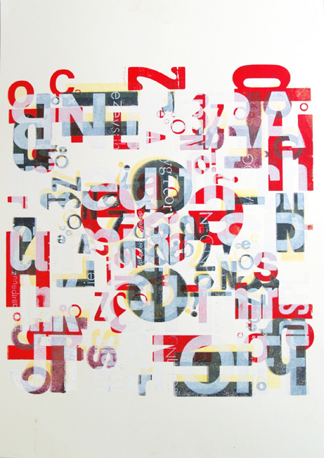 Alle drei Sätze sind in dem Format 27 cm x 27 cm angelegt, also quadratisch. So konnte ich durch Drehen des Satzes eine Variation des Druckes erzielen, aber auch alle übereinander legen. Da die drei Sätze so unterschiedlich sind entstehen interessante Kontraste, die durch die Grundfarben Gelb, Rot und ein Mischton von Blau hervorgehoben werden. Als Variation habe ich zunächst jeden Satz durch kleine Veränderungen übereinander gedruckt, wie Drehen oder teilweise Verdeckungen. Später habe ich für eine größere Verdichtung der Staben mehrere geschichtet, meist mit deckenden Farben, aber teils auch durch Lasuren. So entstehen Überlagerungen der Formen und es entsteht der Eindruck neuer Konturen, collageartig.