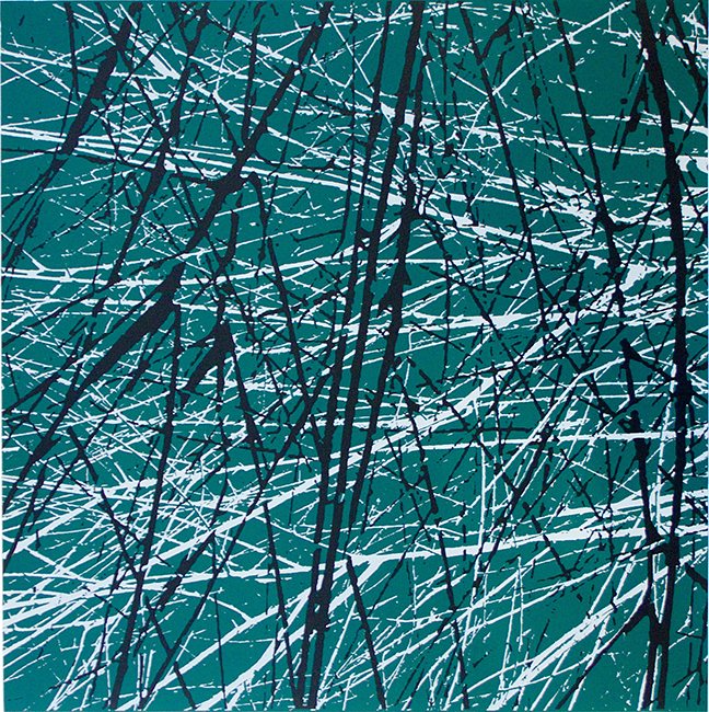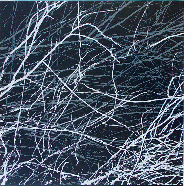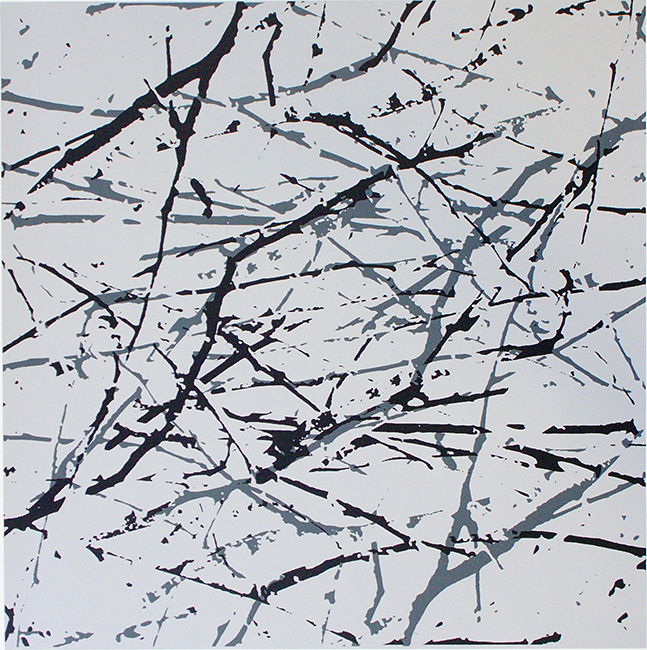 Natürliche Strukturen sollen im Siebdruck grafisch umgesetzt werden. Als Motiv eignen sich Zweige besonders gut, denn sie weisen von sich aus schon vielfältige Strukturen auf. Die Abbildungen von kahlen Zweige wurden dahingehend bearbeitet, dass keine Plastizität mehr erkennen ist. Demnach sind die Strukturen nur noch durch Striche und Linien sichtbar und die Abbildungen haben kaum noch Naturhaftes. Durch die Betonung des Linearen wird abstrahiert und eine grafische Wirkung erzielt. Um den abstrakten Charakter zu betonen, wurde ein quadratisches Bildformat gewählt, da ein solches vom gewohnten Seheindruck abweicht. Aus dem gleichen Grund fiel die Entscheidung zugunsten von Schwarz-Weiß-Darstellungen, wodurch auch die Konzentration auf die Strukturen verstärkt wird, denn keine bunten Farben lenken ab. Es wurden drei Grautöne verwendet: hell, mittel und dunkel. Auf ein hellgraues Quadrat sind mittelgraue und dunkelgraue Zweige gedruckt. Zu jedem Motiv gibt es ein dunkles Pendant, ein Negativ mit dunkelgrauem Hintergrund, mittelgrauen und hellgrauen Zweigen. Bei weiteren Serigrafien kommt noch ein warmer Braunton oder ein kühler Grünton hinzu. Durch die verschiedenen, sich überlagernden Grautöne wird eine räumliche Wirkung geschaffen. Je stärker der Kontrast, umso größer die Tiefenwirkung. Die Zweige sind mitunter immer weiter heran gezoomt. Je kleiner der Bildausschnitt, umso abstrakter und sogar malerisch ist das Motiv. hat.