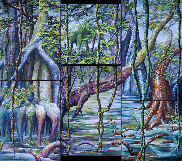 Zwei der drei Bilder setzen sich aus sechs bzw. sieben Leinwänden zusammen. Der Blick des Betrachters springt zwischen den Einzelbildern hin und her, genauso wie die Affen in den Bäumen umher springen. Die Einzelbilder fügen sich zwar motivisch jeweils zu einem Gesamtbild, stehen aber aufgrund ihres Bildausschnittes und einer farblichen Eigenheit auch jedes für sich.