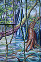 Die perspektivische Staffelung und Überlagerungen der Baumstämme lassen Bildtiefe entstehen. Der Blick des Betrachters gleitet die Baumstämme auf und ab, verfolgt die Verzweigung der Äste und Wurzeln und wird dadurch immer wieder umgeleitet.