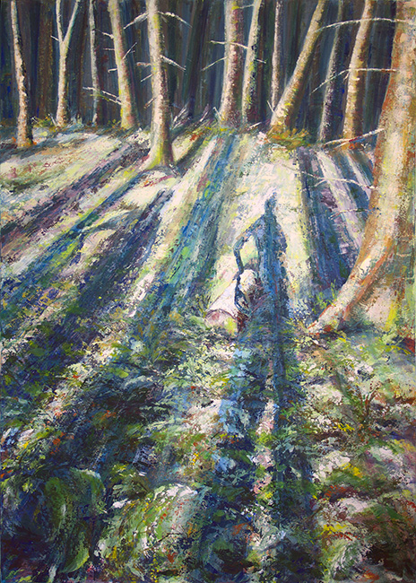 So erzeugen die langen Schatten der Bäume in den Abendstunden und der dunkle, nicht einsehbare Wald in der Ferne eine beunruhigende Stimmung. Die Schatten der Waldbesucher reihen sich in die Schatten der Bäume ein.