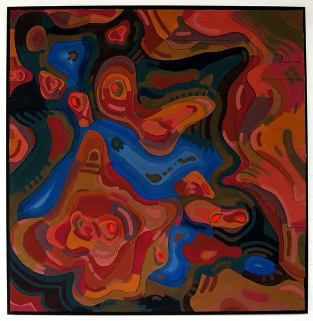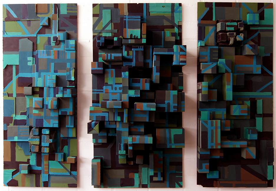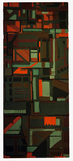 Durch das Aufbringen von einzelnen Pappschichten ergeben sich Flächen, auf denen sich die reine Farbe entwickeln kann, die hier im Vordergrund steht. Es entstehen Farbräume, die eine Spannung zueinander aufbauen, teils durch ihren krassen Gegensatz, teils durch kaum merkliche Abstufungen. Diese sollen von den Pappschichten getragen werden, die die Farbflächen unterstreichen, oder deren Form zerstören, sodass eine in sich treibende Komposition entstehen kann.
