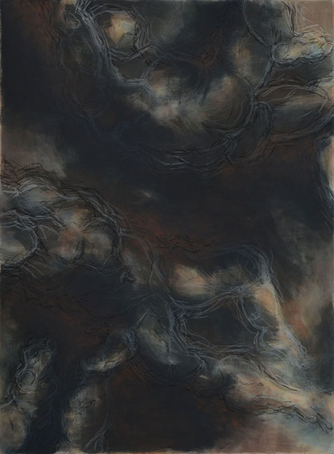 Der Arbeitsprozess begann in der Regel mit einer Vorzeichnung von weißer Ölkreide auf den jeweiligen Untergrund, auf welche ich mehrere Schichten immer dunkler werdender Acrylfarbe sowie weitere Zeichnungen mit schwarzer Ölkreide aufgetragen habe.