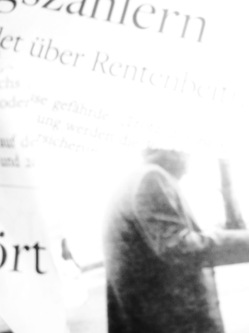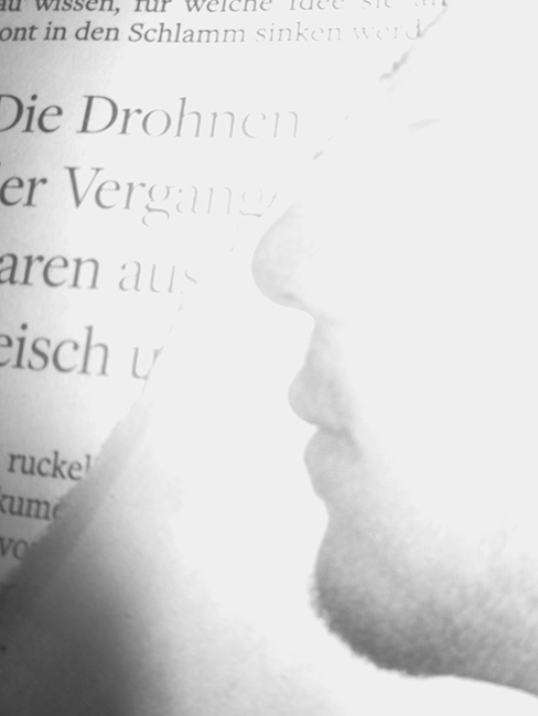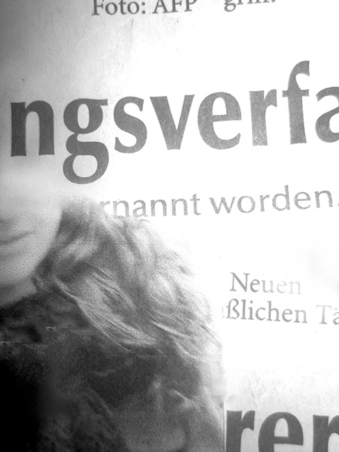 In jeder Sekunde ereignen sich weltweit eine Vielzahl komplexer Ereignisse. Die Berichterstattung der Zeitungen gibt den Lesern täglich in komprimierter Form Auskunft über die aktuellen weltweit wichtigsten Themen und Ereignisse. Zeitungen sind Informationsträger. Die Übertragung der Informationen gelingt innerhalb der Zeitungen mittels Schriften und Bildern. Wer eine Zeitung aufschlägt und liest, erhofft sich durch dieses Tun Informationen, Klarheit und Aufklärung. Bei der vorliegenden fotografischen Arbeit wird diese Intention jedoch nicht befriedigt. Die ursprüngliche Funktion der Zeitung wird außer Kraft gesetzt. Zwar hat der/die BeobachterIn aufgrund der vergrößerten Schriftzüge und angeschnittenen Bildern den Eindruck, als würde er/sie mit einem Fernglas in eine Zeitung blicken. Dennoch gelingt es nicht Klarheit darüber zu erlangen, wie die Bilder und Schriften zueinander in Beziehung stehen. Bei der Betrachtung der Fotos erkennen die BeobachterInnen angeschnittene Bildelemente, die sie zwar benennen können, die aber gleichzeitig auf Grund ihrer nicht kompletten Darstellung im Unklaren bleiben. Hinter den Augen, Haaren, Mündern Körpern und Fahrzeugen könnte sich jeder verstecken - die Identitäten bleiben ungeklärt. Ebenso gestaltet es sich mit den Schriftzügen. Manche können entziffert werden, andere sind nur schemenhaft abgebildet oder angeschnitten und daher nicht lesbar. Wer? Was? Wann? Wie? Wo? Und Warum? Diese Fragen bleiben in der vorliegenden fotografischen Arbeit unbeantwortet. Es gibt für sie keine festgeschriebene Lösung. Die Betrachter werden in einen Zustand der Verwirrung versetzt und dennoch überleben sie ihn. Sie überleben ihn vielleicht verärgert, unbefriedigt, belustigt, vielleicht aber auch motiviert dazu öfter die gewohnten Sichtweisen zu verändern und andere Perspektiven einzunehmen und Verwirrungen zu (v)agen. Denn Unschärfe und Unklarheit muss kein Mangel sein, sondern sie kann eine Möglichkeit sein, den Blick zu weiten und der Fantasie freien Lauf zu lassen.