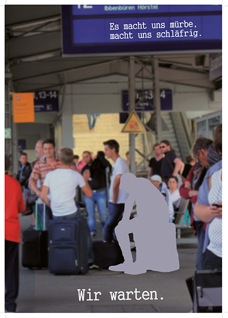 Die Graugefärbten Personen scheinen somit anonym zu sein, sind aber Abbilder von uns selbst, da wir –je nach dem worauf wir warten und wie wir uns grade fühlen- uns ganz ähnlich verhalten. So kann sich der Betrachter in mindestens eine der grauen Personen mit dem Schriftzug auf den Plakaten wiederfinden.