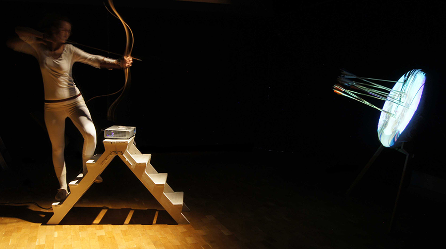 Madonna, die Queen of Pop, scheinbar stark, unabhängig, selbstständig. Sie steht für Erfolg und Medienspektakel. Der ständige Wechsel ihrer Masken, um sich immer wieder neu zu erfinden und somit auch neu beachtet zu werden, die Schönheitsoperationen der letzten Jahre, all dies ist auf Kapital aufgebaut – sie ist nicht, sie besitzt. Sehr ausdrücklich benutzt sie die Camouflage der Frau um zum Sprechen zu kommen und so kommt letztendlich nicht sie zum sprechen, sondern der männliche Diskurs spricht durch sie. Meine Generation, die Generation der neunziger Jahre, wurde von Menschen wie Madonna geprägt. Die ganze Pop-Industrie predigt uns: Tragt Masken, durch sie werdet ihr beachtet, kauft euch schön. Kapital bedeutet Macht und vor allem auch Aufmerksamkeit in unserer heutigen Welt. Frauen benutzten es um zu gefallen und somit angehört zu werden. Diese Klischees und gesellschaftlichen Erwartungen haben die Kinder meiner Generation geprägt und beeinflussen sie. In der Peformance werde ich zu ihrer Stellvertreterin. Madonnas Gesicht, auf eine Zielscheibe projiziert, überlagert sich nach und nach mit meinem eigenen. Währenddessen schieße ich mit Pfeil und Bogen auf das Madonna-Ich. Symbolisch werden so suggerierte Idealbilder getötet.