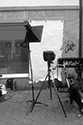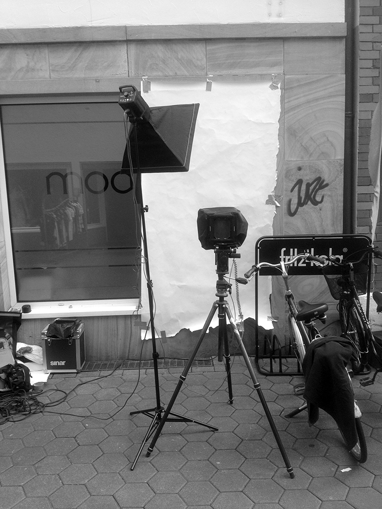 Jeder Mensch inszeniert sich selbst. Jeden Tag. Durch ganz simple Dinge wie die Wahl seiner Kleidung, seiner Frisur oder der Dinge, die er mit sich herum trägt. Dies nutzte ich für mein Projekt, indem ich den Modellen keine Zeit ließ sich physisch oder psychisch lange auf ein „Fotoshooting“ vorzubereiten. Ein kleines Stück Hauswand mitten in der Stadt, ein kleines Stück weißer Fotohintergrund, ein Blitz, eine Großformatkamera und ein wenig Aufdringlichkeit – das waren meine Werkzeuge. Ich sprach mal mehr mal weniger wahllos Personen an und versuchte sie davon zu überzeugen, sich kurz von mir in meiner Installation fotografieren zu lassen. Den Personen die sich bereit erklärten Modell zu stehen, habe ich die freie Wahl gelassen was Pose, Gesichtsausdruck oder Körperhaltung für das Foto angeht, jeder der Beteiligten sollte sich selbst in Szene setzen und wohl fühlen.
