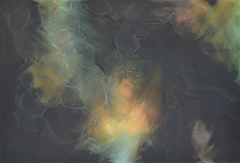 Der Arbeitsprozess beginnt in der Regel mit einer Vorzeichnung von weißer Ölkreide auf den jeweiligen Untergrund, auf welche ich mehrere Schichten immer dunkler werdender Acrylfarbe sowie weitere Zeichnungen mit schwarzer Ölkreide und neuerdings auch weißer und schwarzer Pastellkreide auftrage.