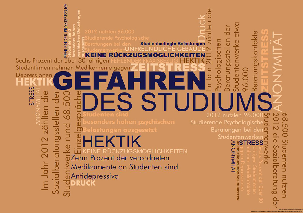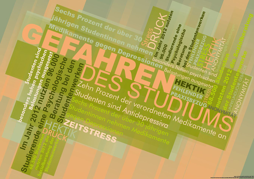 Jeder dritte Student gibt an, unter Konzentrationsstörungen und Nervosität zu leiden. Zudem nehmen angehende Akademiker mehr Psychopharmaka ein als ihre Altersgenossen, denn zehn Prozent der verordneten Medikamente an Studenten sind Antidepressiva. Die Dunkelziffer ist hoch. Diese Ergebnisse sind alarmierend und werden dennoch kaum publik gemacht, weswegen ich diese Thematik in meiner sechsteiligen Plakatreihe „Gefahren des Studiums“ aufgegriffen habe. Die Umsetzung erfolgte durch den Gebrauch von Textmaterial, welches in verschiedenen typographischen Arrangements angeordnet wurde. Dabei wurden die Variationen durch unterschiedliche Farbwahlen und verschiedene Schriftcharakteristika bestimmt. Infolgedessen wurden Farbe, Schrift und Form in unterschiedlichen Komposition dargestellt.