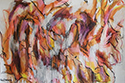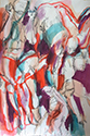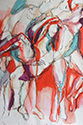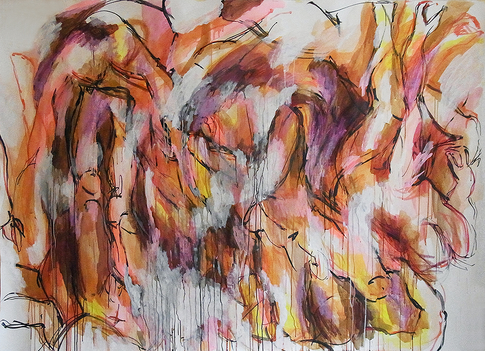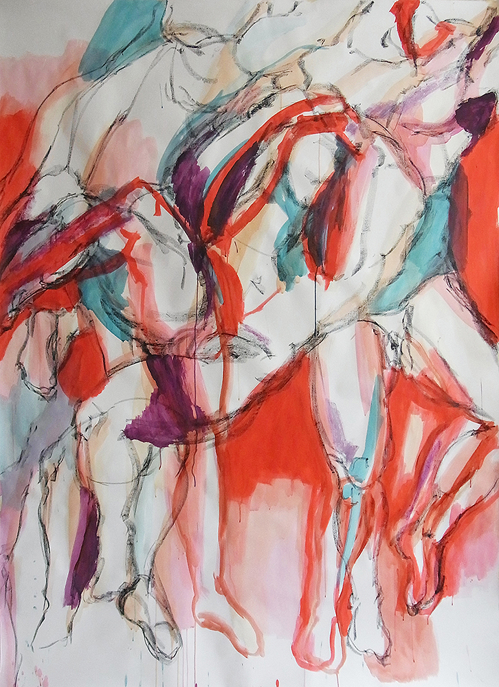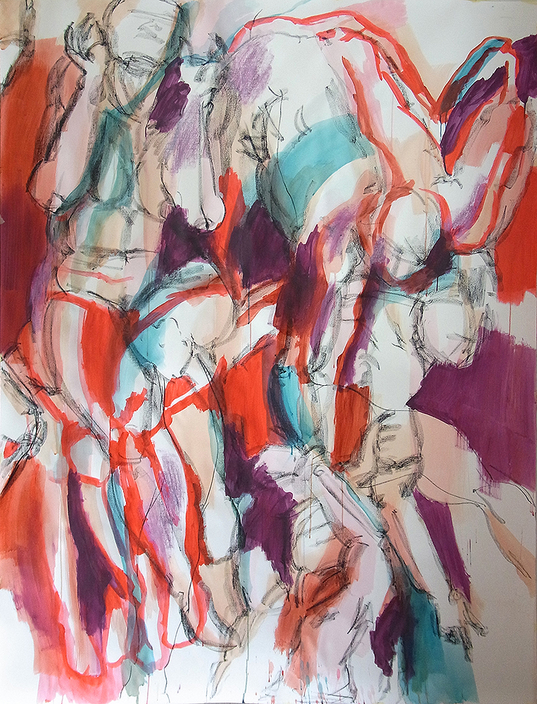 In einer Arbeit verschwanden die dünnen Bleistiftlinien völlig. Diese Arbeit wirkt dadurch ruhiger, Dynamik entstand nur durch den schnellen Duktus mit dem die Farbflächen modelliert wurden. Durch vielfache Übermalung verloren sich die Körper in einem nahezu landschaftlichen Bildgefüge.