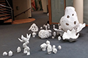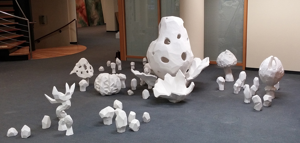 Die mehrteilige Komposition "Der Organismus expandiert" ist vom beeindruckenden Formenreichtum der Pilze inspiriert. Diese werden kubistisch verfremdet und ihre organischen Formen in Einzelflächen aufgelöst. Ausgewählte Elemente verbinden sich zu aus der Natur bislang unbekannten Gebilden, die fremd und vertraut zugleich wirken. Wie eine Pilzkolonie in Wahrheit nur ein einziger Pilz ist, der oberirdisch mehrere Fruchtkörper ausgebildet hat, sind auch die Skulpturen als ein zusammengehöriger Organismus zu verstehen. Im Zentrum steht ein voluminöser, von Öffnungen durchbrochener Hohlkörper mit blattartigen Strukturen, der als komplexeste aller Formen die Aufmerksamkeit auf sich zieht. Um ihn herum sind kleinere Skulpturen angeordnet, deren Detailreichtum nach außen hin abnimmt. Sie finden sich zu Ausläufern zusammen, die sich in den Raum hinein auszubreiten scheinen. Es entsteht so der Eindruck von Bewegung, vielleicht sogar von Wachstum. Der Organismus expandiert.