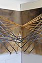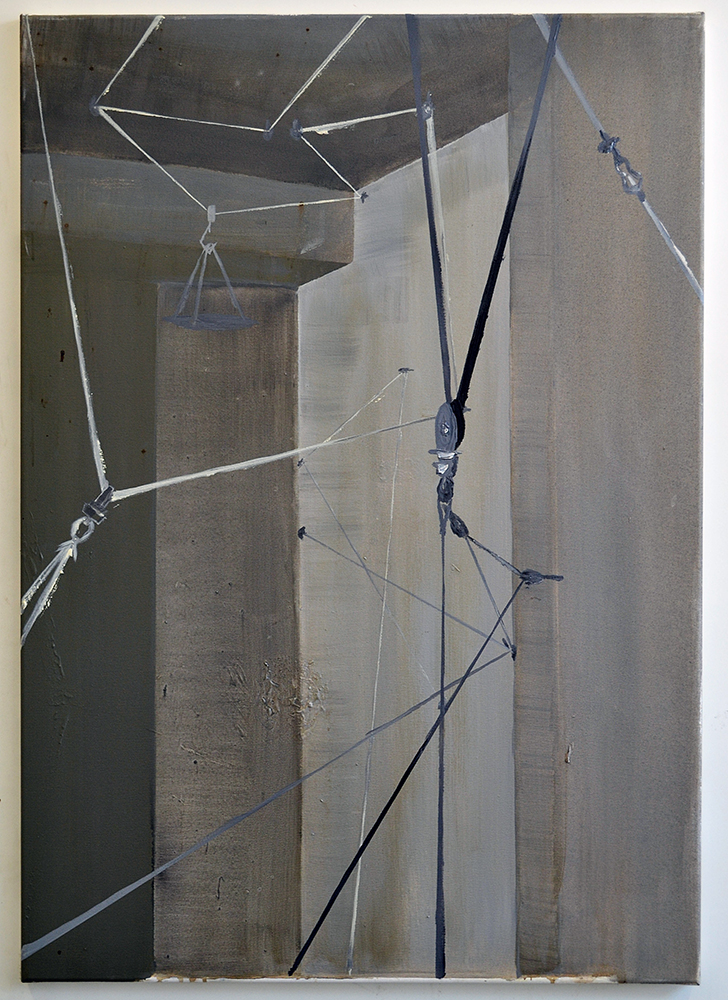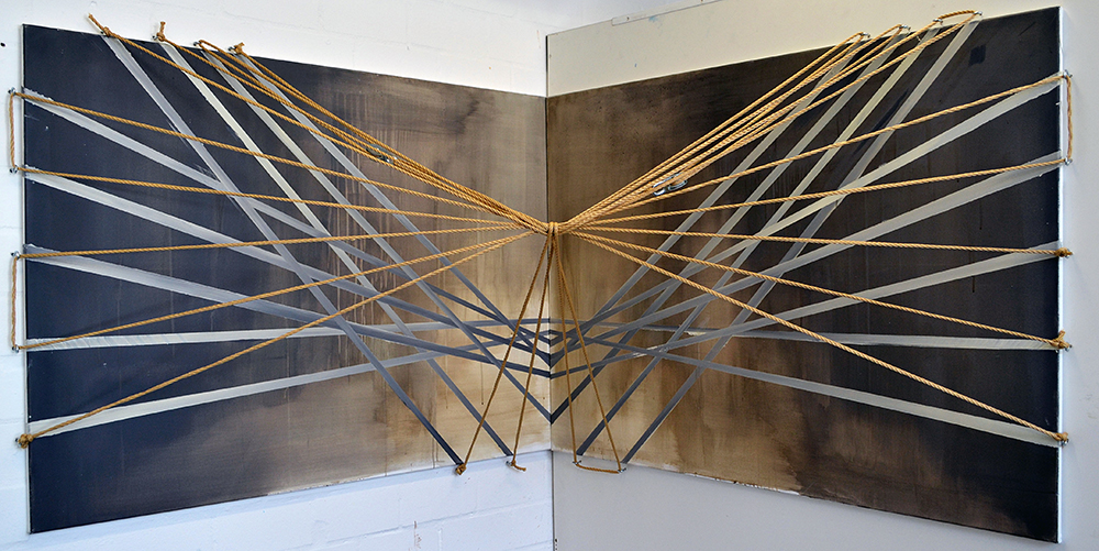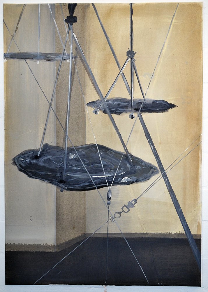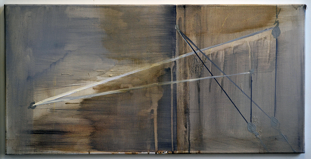 Acrylfarbe, Staub, Kaffee, Gewürzen, Tee, Bier und Chlorreiniger auf Leinwand. Spannung in der Raumdarstellung auf der Fläche.
