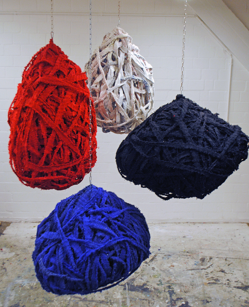 4 hängende, tropfenförmige Skulpturen in unterschiedlichen Farbtönen, bestehend aus mit Acrylfarbe gefärbter Wolle und Drahtgeflecht.