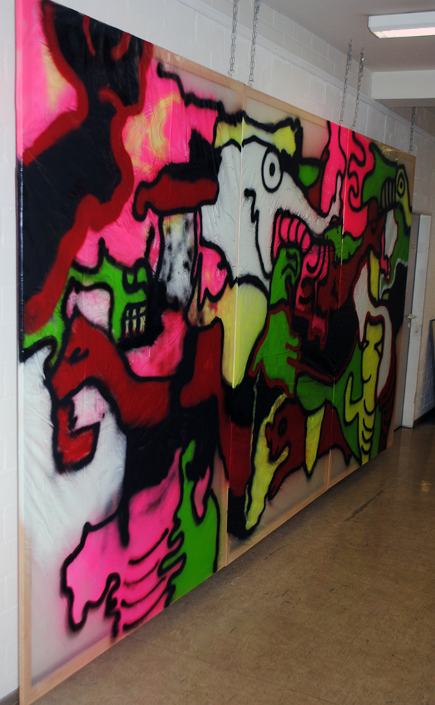 Triptychon aus Kunststoffolie in Neonfarben, welches einzelne Lebewesen zeigt, die in einer abstrakten Formenwelt positioniert sind.