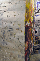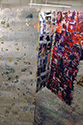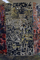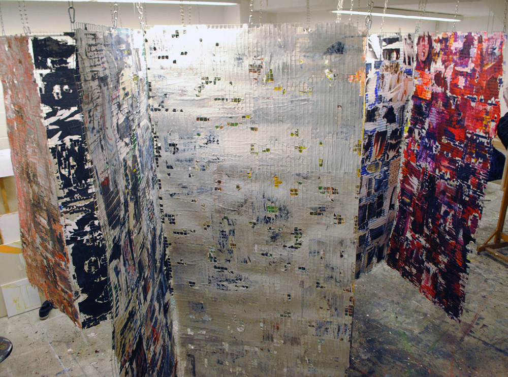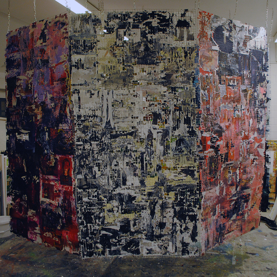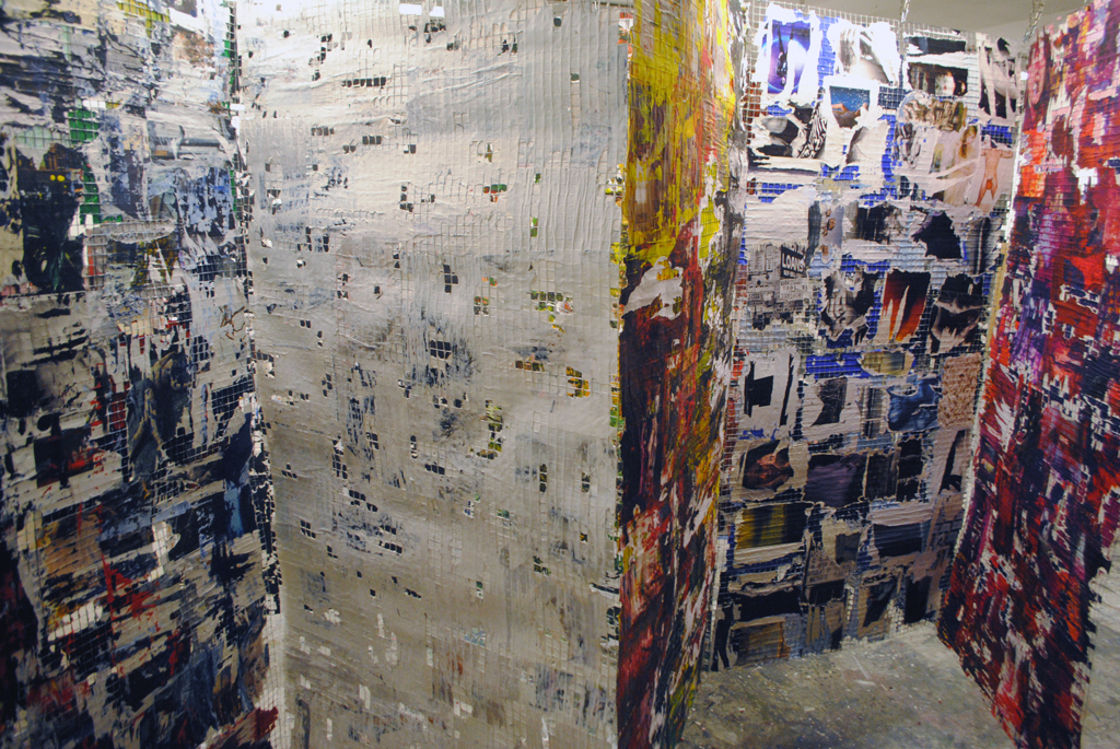 Raumgreifende, begehbare Installation, bestehend aus 11 Gitterdrahtelementen, die mit Zeitschriftenseiten und Acrylfarbe beklebt und bemalt wurden.