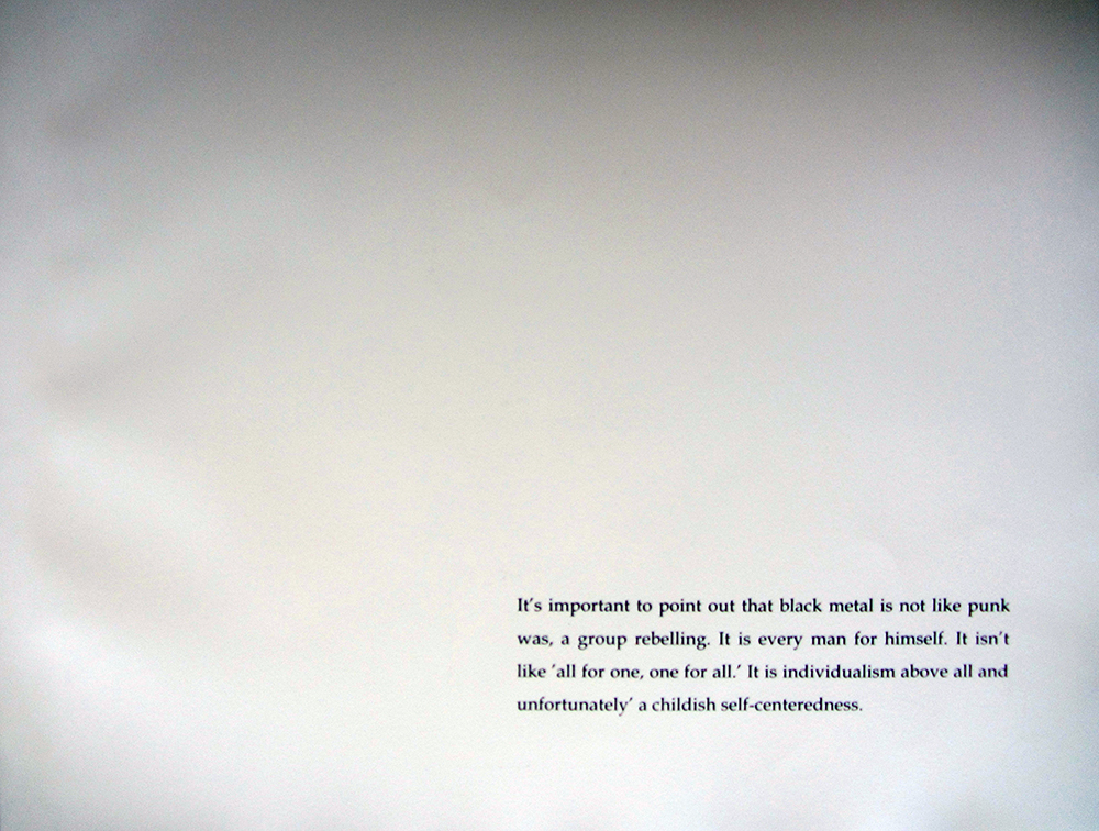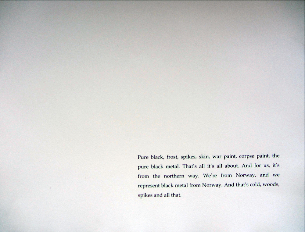 Die Buchedition True Norwegian Black Metal illustriert Textfragmente aus Interviews des gleichnamigen Fotobandes des Fotografen Johan Kugelberg. Mit den Mitteln der Radierung und des Ätzverfahrens werden Worte von bekannten Größen der Musik- und Kulturszene Black Metal aus Norwegen bildnerisch dargestellt. Die Edition besteht aus vier Illustrationen sowie vier Texten, welche im Siebdruckverfahren gedruckt sind. Der Black Metal hat sich in den 1980er Jahren als Subkultur aus dem Metal entwickelt. Vor allem in Norwegen hat sich diese Musik- und Kulturrichtung bis heute fest etabliert. Die Fotografien von Johan Kugelberg verbinden in anschaulicher Weise weitläufige Landschaften Norwegens mit Musikern und Fans aus der Musikszene. Gutturaler Gesang, schnelle Blastbeats und Doublebass, eher monotone und laute Gitarrenriffs, Blut, Spikes, Feuer, Fans und Musiker in Ekstase – das ständige Spiel mit der Provokation - machen diese Subkultur aus. In der Edition werden diese Elemente durch die gewählten Textfragmente sowie die Illustrationen ausgedrückt. Die gewählten Techniken dieser grafischen Edition, die ausschließlich in Schwarz gehalten ist, tragen zum atmosphärischen Inhalt dieser Arbeit bei.