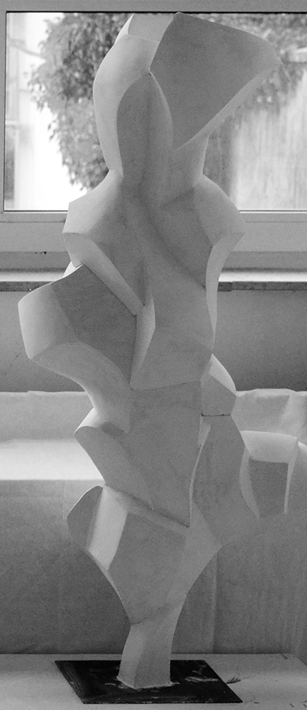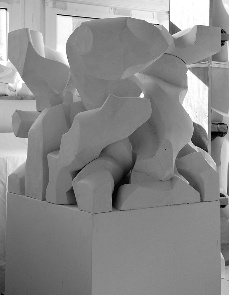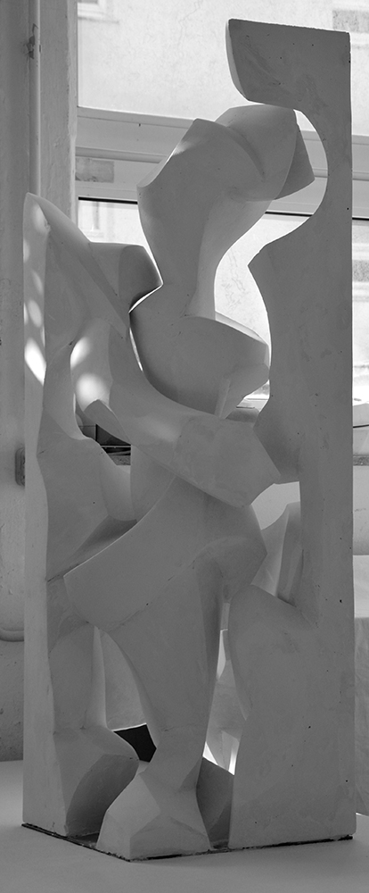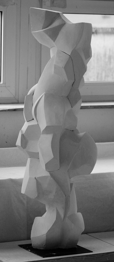 Zentrales Element meiner aktuellen Arbeiten ist die Mehrteiligkeit und die damit verbundene Komposition skulpturaler Elemente. Während in der Reihe Stacked I-III die einzelnen Bestandteile direkt aufeinander lasten und sich lückenlos ineinanderfügen, wird bei Cathedral durch die einander berührenden Einzelskulpturen eine Art Innenraum gebildet, in dem Licht und Schatten mit den Flächen und Kanten des Materials zu spielen beginnen und das Auge immer neu herausfordern.