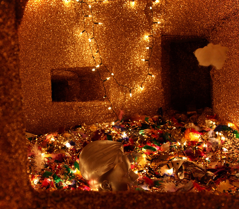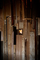 Die Thematik wird in einer aufwendig konstruierten, raumgreifenden Holzkonstruktion verarbeitet. Mittels Bild- und Toncollagen werden die Betrachterinnen und Betrachter ungewöhnlichen Perspektiven ausgesetzt.