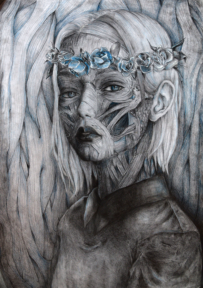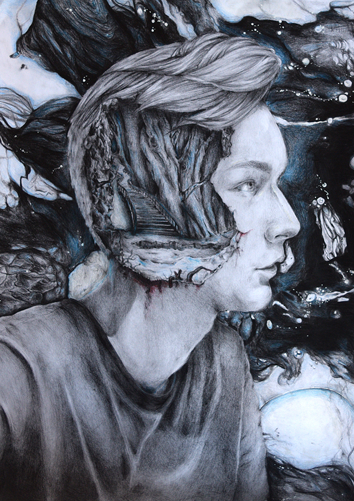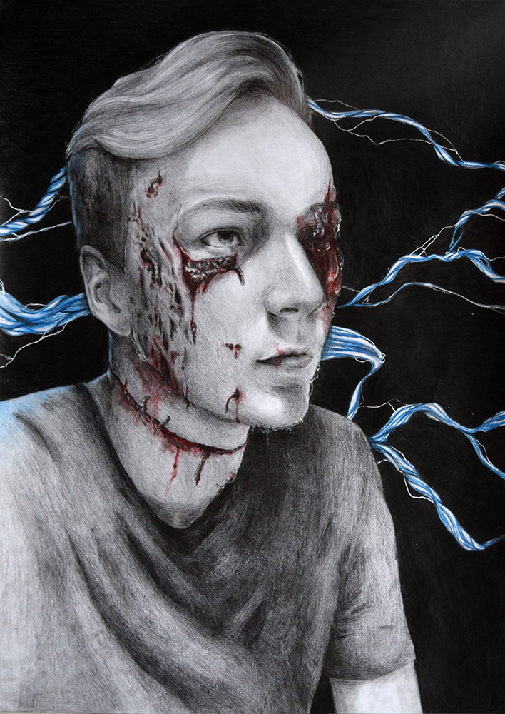Destruktion – Konstruktion. Beide Begriffe sind der Ursprungsgedanke meiner Portraitzeichnungen. Ausgehend von der Auflösung des menschlichen Gesichtes innerhalb seiner Beschaffenheit habe ich zur surrealen Verfremdung gefunden. Die Destruktion, das heißt die Zerstörung, das Niederreißen, steht mit der Konstruktion, dem Schaffenden, Lebendigem, in einem bildlichem Kontext. Der Schwerpunkt der Reihe liegt darauf, dass die Figuren der Destruktion ausgesetzt sind und gleicheizeitig entweder im Kontrast oder in Verbindung zur Konstruktion stehen. Jedoch beeinträchtigt die Verfremdung die Figuren nicht oder sie sind sich dieser nicht bewusst. Der Bildausschnitt ist so gewählt, dass alle Portraits im Brustbereich enden und so der Fokus auf dem Gesichtsausdruck der Person liegt. Der Betrachter steht so in engem Kontakt mit der Figur ohne jedoch Teil des Bildkontextes zu werden.
