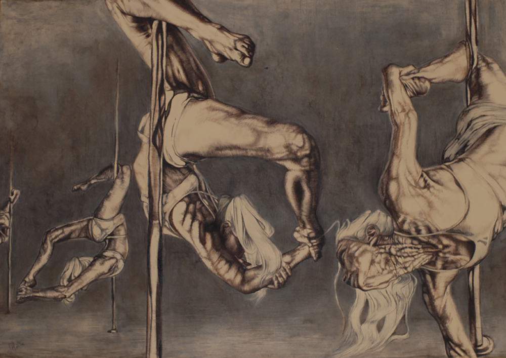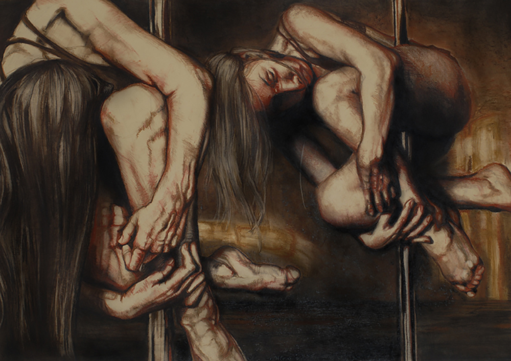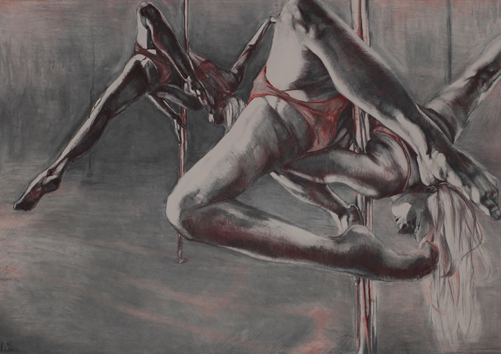 Die Bilderreihe zeigt eine graphische Auseinandersetzung mit einigen Figuren aus dem Sport „Poledance“. Diese Form des Tanzes unterscheidet sich von den Anderen durch die Verwendung einer Stange. Mit diesem Sportgerät entstehen neue tänzerische Möglichkeiten der Ausführung von Bewegungen und Haltungen in der Luft über eine längere Zeit. Zusätzlich eröffnen sich neue Perspektiven und Winkel in denen die Tänzer/innen betrachtet werden können.